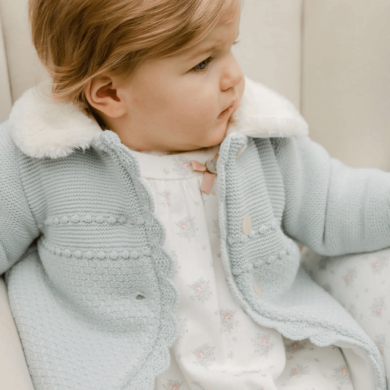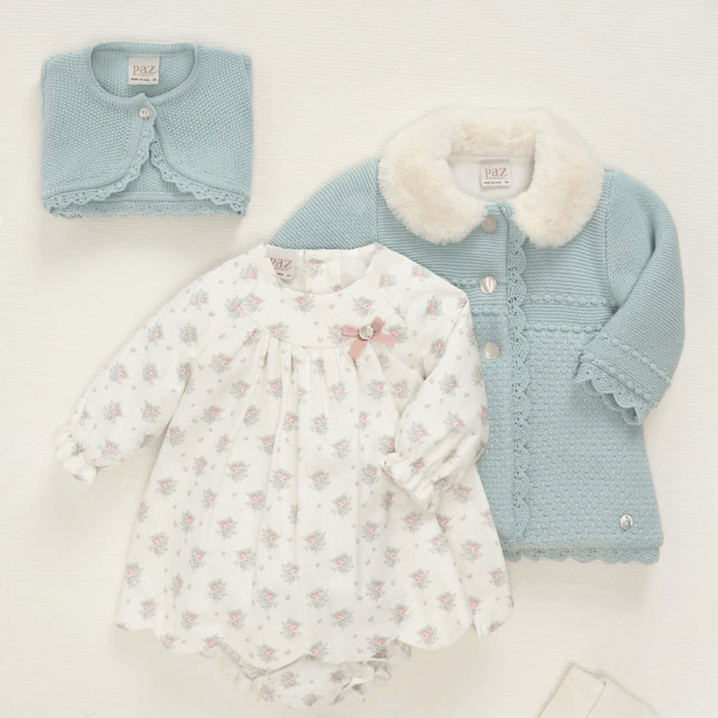 Vestido estampado flores semilla Paz Rodríguez , invierno con braguita. Este vestido se presenta con un corta amplio tipo trapecio, Mangas ligeramente abullonadas con terminación en puño fruncido y cuello redondo clásico con acabado limpio y suave. La base es de color blanco crema. El estampado de flores se presentan en rosa empolvado, azul cielo y toques de verde todos suaves. Lazo decorativo rosa en el pecho, acompañado de un botón central que añade un toque artesanal. La braguita a juego incluida, con el mismo estampado flora, perfecta para completar el conjunto. Disponible abrigo a juego, consúltanos!!!!