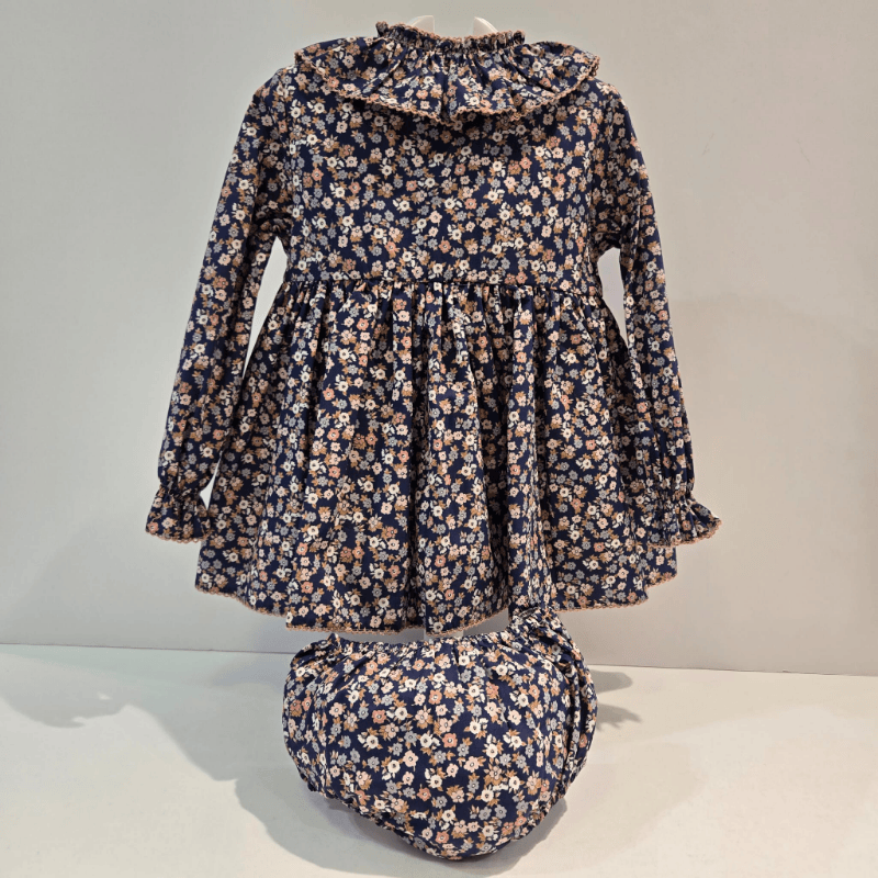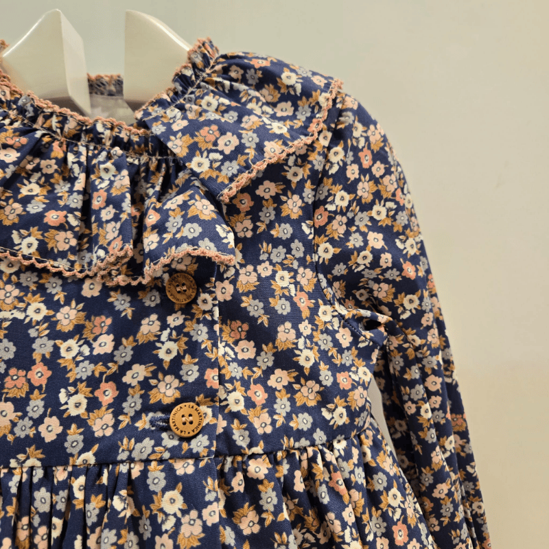 Vestido flores mi petit mon La Martinica otoño invierno 2025/26. Vestido infantil de la colección Petit Mon de La Martinica, temporada otoño-invierno 2025/26. Confeccionado en tejido de algodón suave con estampado floral en tonos blanco y rosa sobre fondo azul profundo, este diseño evoca la dulzura de los días frescos con un toque romántico. El patrón del tejido presenta flores pequeñas distribuidas de forma armoniosa, aportando un aire clásico y atemporal. El corte es recto con caída natural, ligeramente evasé para mayor comodidad, y se complementa con mangas largas abullonadas que terminan en puño cerrado. El cuello se adorna con un gran lazo central unido al la espalda por el centro, aportando elegancia y encanto. Cierre trasero con cremallera para facilitar su uso. Ideal para ocasiones especiales o para dar un toque chic al día a día y es de la temporada otoño invierno de la firma La Martinica.