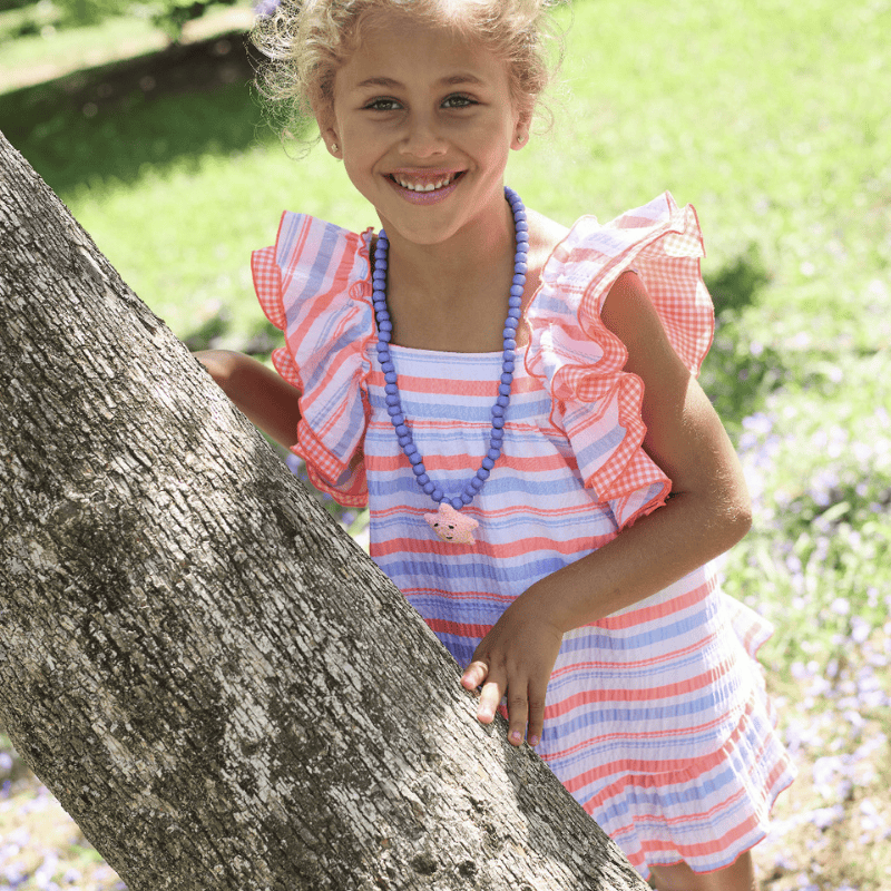 Vestido de niña de la colección Bike de La Martinica para la temporada primavera–verano 2026, confeccionado en un tejido ligero y muy cómodo, perfecto para los días más luminosos. Presenta un estampado de rayas en tonos flúor, azul y blanco, una combinación vibrante y alegre que refleja a la perfección el espíritu veraniego de la firma. El diseño destaca por sus mangas con volantes, que aportan movimiento y un aire coqueto, y por su gran lazo en la espalda, protagonista absoluto de la prenda y sello inconfundible de la colección. La espalda queda ligeramente abierta, creando un efecto fresco y encantador sin perder comodidad. La falda tiene una caída suave y ligera, ideal para jugar, pasear o disfrutar de cualquier plan al aire libre. Un vestido pensado para niñas que disfrutan del verano con estilo, color y mucha personalidad.