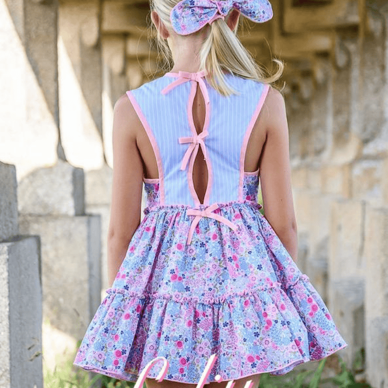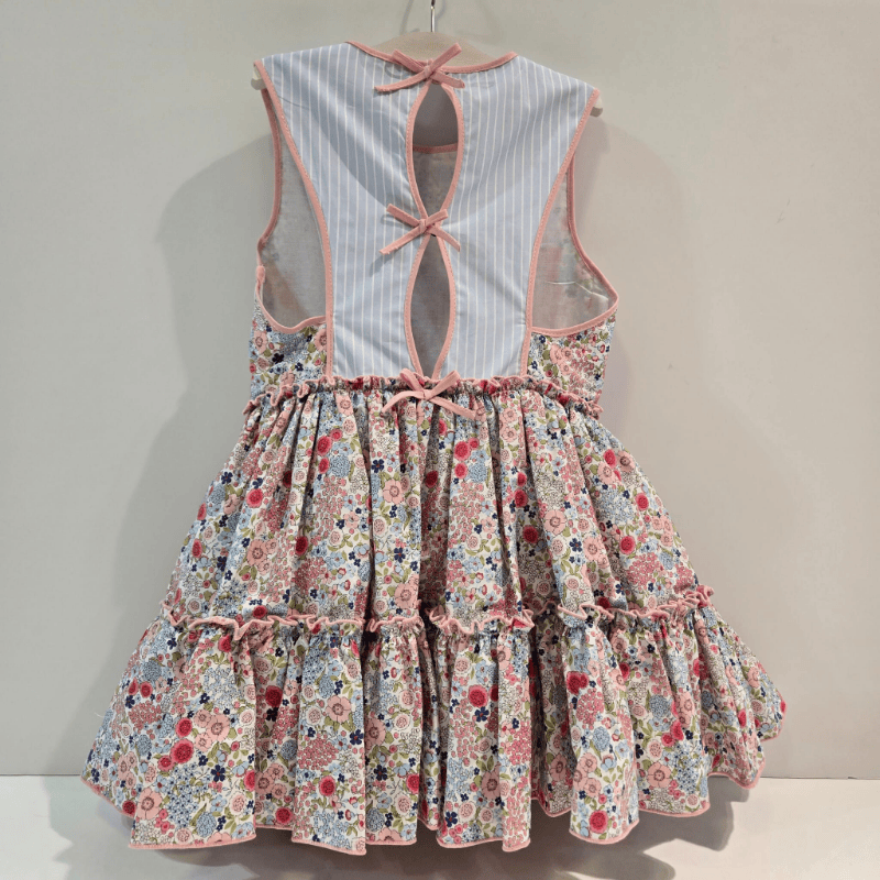 Vestido estampado de la colección Fauna de primavera-verano 2026 de Lolittos, confeccionado en tejido ligero con patrón floral en tonos rosa, azul y lavanda. El corte sin mangas presenta un cuerpo entallado floral en celeste, fucsia, azules y fondo blanco roto, realzado por trenzado de lazos rosa pastel en la espalda. La falda de vuelo con doble volante aporta movimiento y frescura, mientras el gran lazo disponible a parte a juego en el cabello completa el conjunto con encanto. Ideal para ceremonias y paseos estivales, este diseño combina estructura clásica con detalles románticos, evocando la alegría del verano en cada costura.