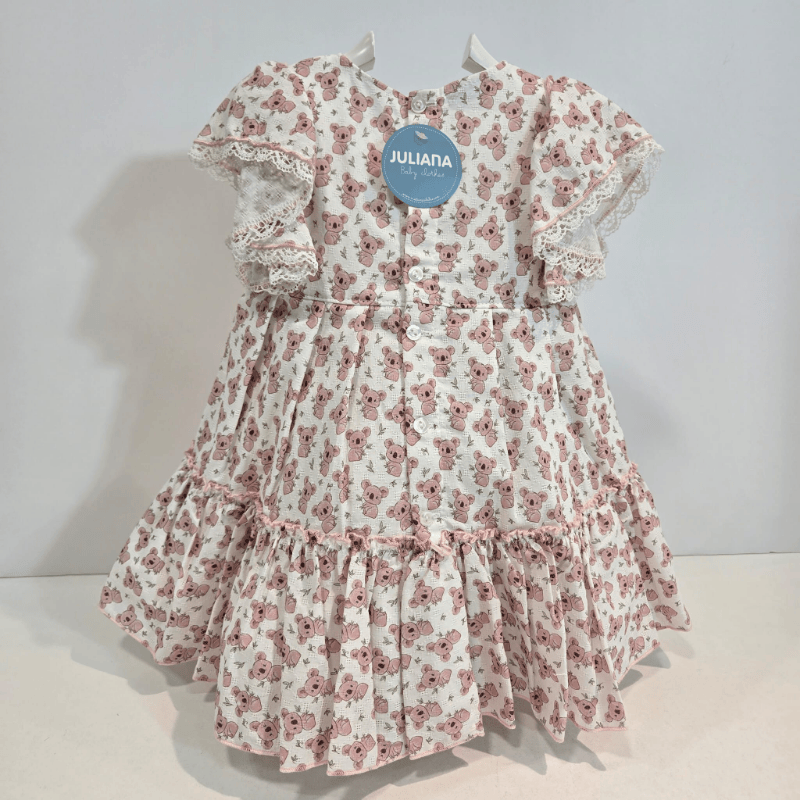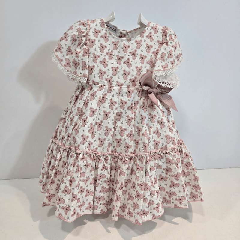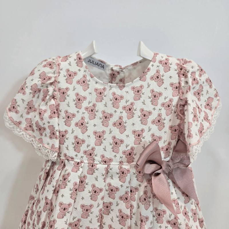 Vestido volantes tela estampada lazo koalas verano. Este vestido es una explosión de ternura y frescura para la temporada primavera–verano de la firma Juliana. Confeccionado en una tela suave estampada con adorables koalas, destaca por sus volantes delicados y un lazo lateral que aporta un toque encantador y muy especial. Las mangas con detalle de puntilla y la falda con vuelo ligero crean un diseño cómodo, aireado y perfecto para los días luminosos. La prenda ofrece libertad de movimiento y una caída suave que acompaña cada paso, ideal tanto para paseos como para momentos tranquilos en casa. Un vestido alegre, coqueto y lleno de encanto para disfrutar del verano con estilo.